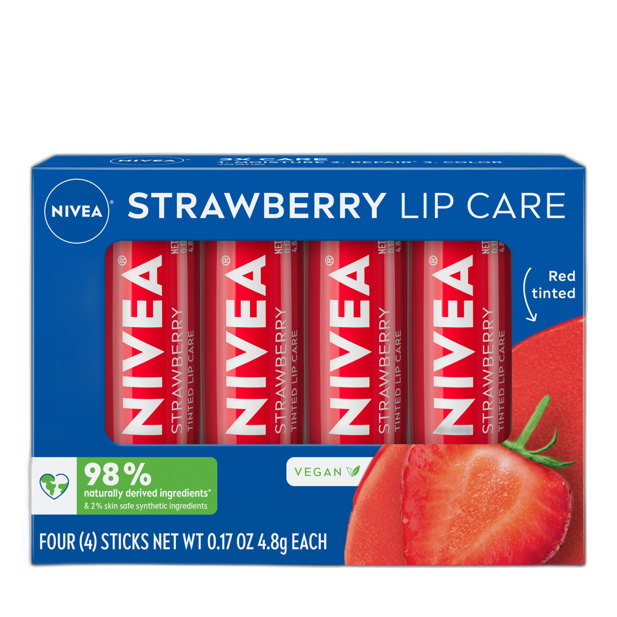 NIVEA Strawberry Lip Care, Tinted Lip Balm Pack with Shea Butter, Nourishing Oils and Vitamin C & E, 3-in-1 Moisture, Repair and Color, 0.17 Oz Stick, Pack of 4